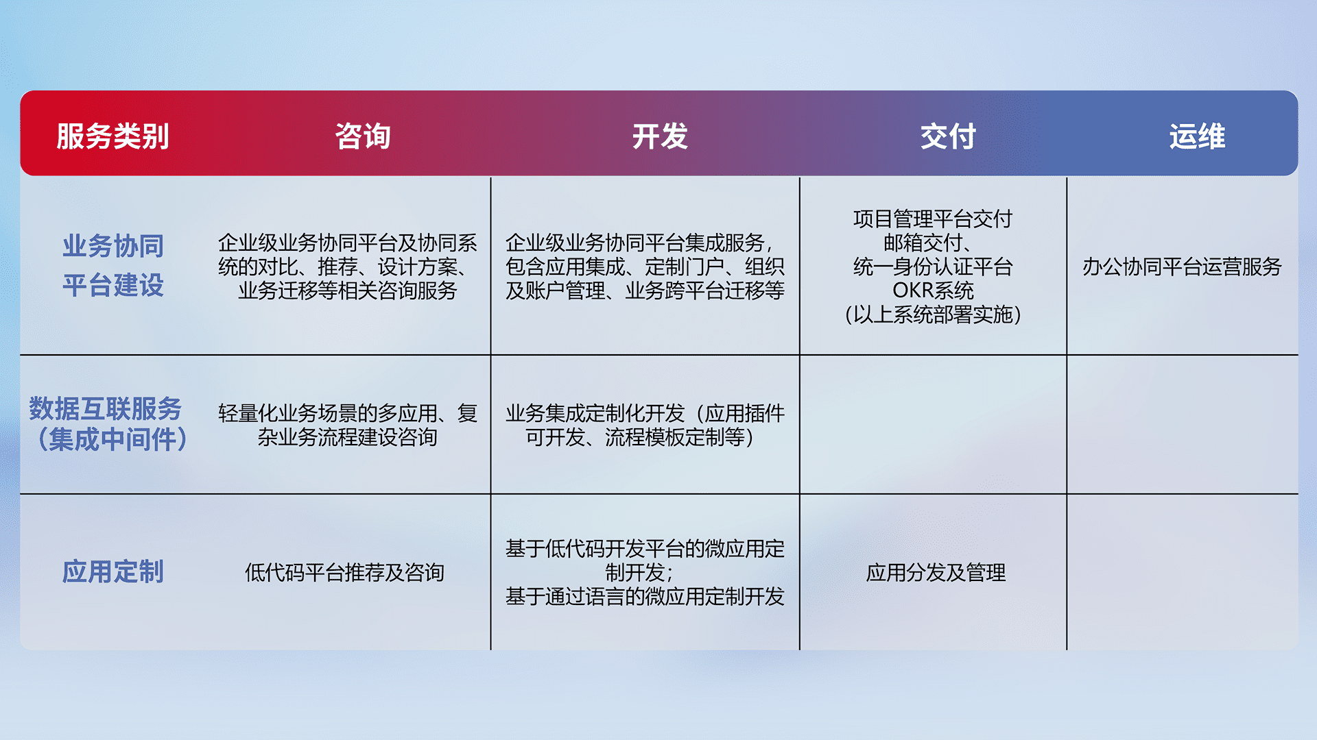 针对钉钉、、、企微、、、、IDaas等平台级产品提供产品的规划、、、方案、、、交付、、、定制化开发等服务,,,实现如统一协同办公、、智能客户服务、、、混合会议管理、、智能数据查询、、、、等业务场景,,,实现数字化转型。。